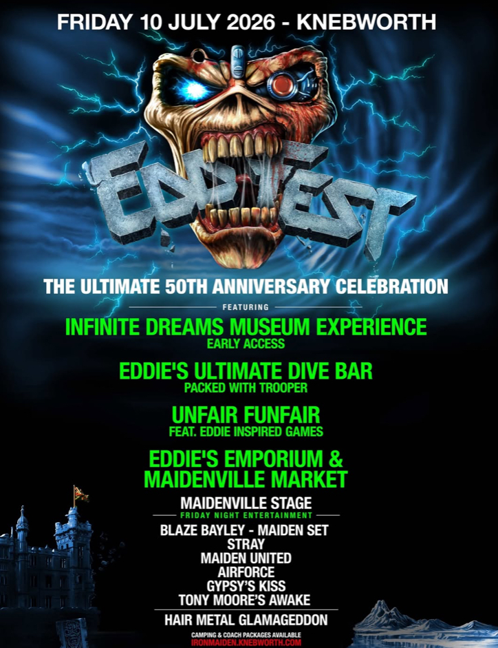 Acerca de las nuevas incorporaciones, Harris señaló con entusiasmo. “Tener la oportunidad de armar nuestro propio festival en Knebworth y celebrar 50 años de Iron Maiden, me ha dado la oportunidad de reunir a mis amigos del pasado y el presente y crear un fin de semana realmente especial para los fans. Estoy muy complacido que Blaze se una a interpretar algunas canciones que escribimos y grabamos en los noventa. Él fue parte importante de la carrera de Iron Maiden, y sé que los fans así lo entienden y se emocionarán al verlo en el escenario del Eddfest. También es grandioso tener a Gypsy´s Kiss tocando con nosotros. Ellos fueron una parte importante de mi patrimonio musical, y me resulta muy emotivo tenerlos tocando en el escenario ‘Maidenville’”.